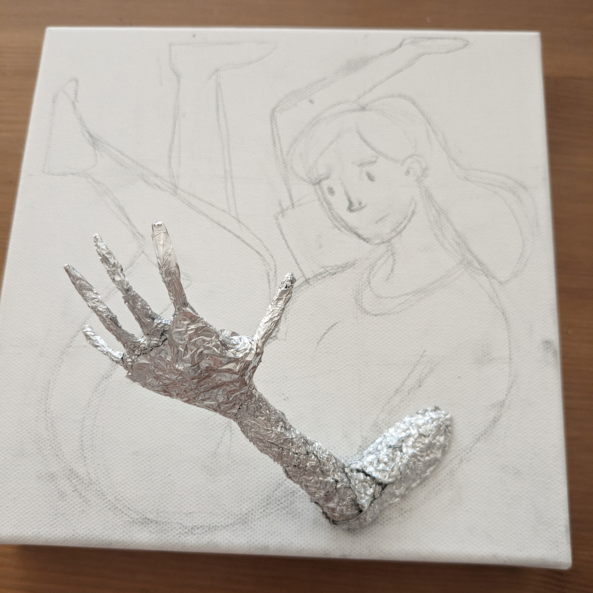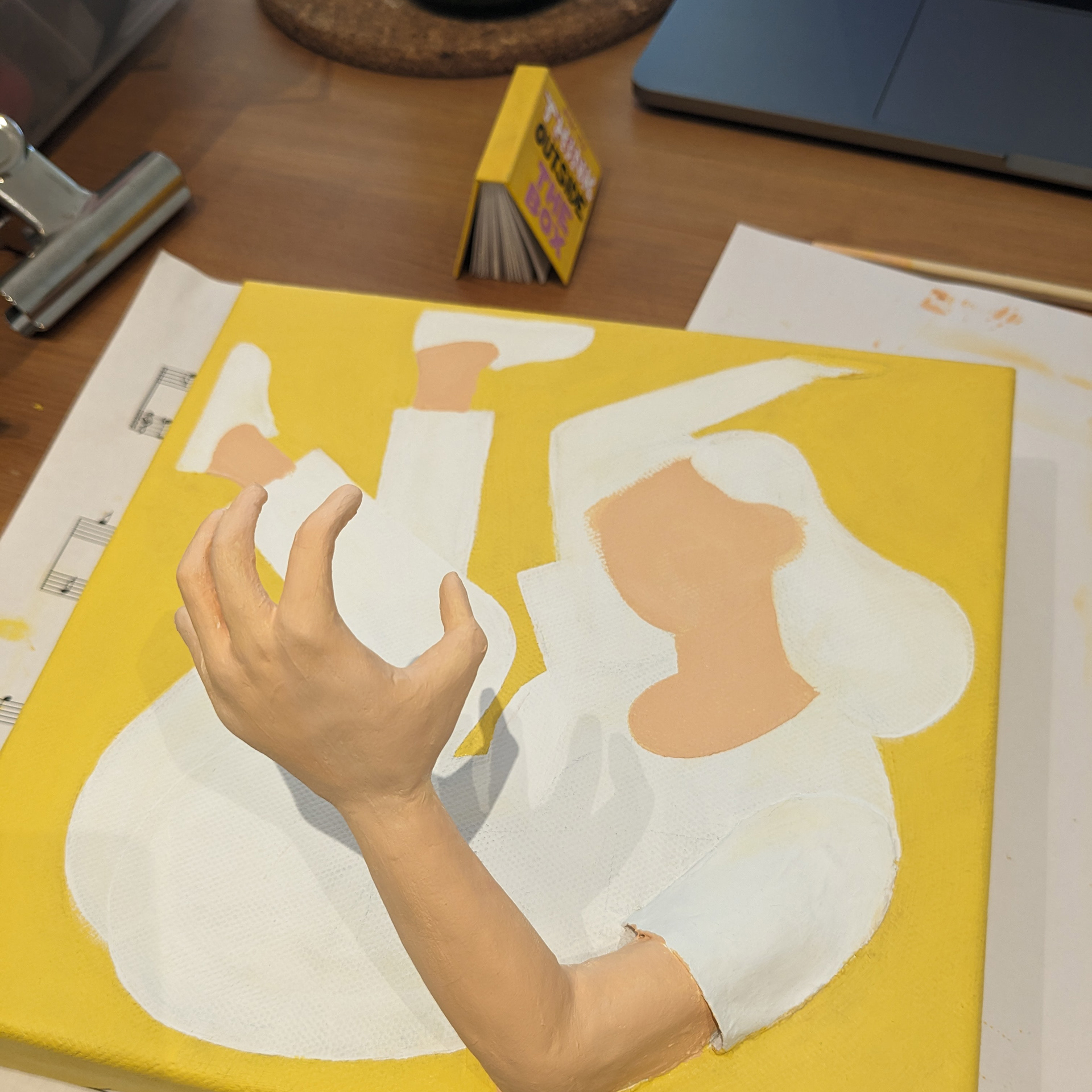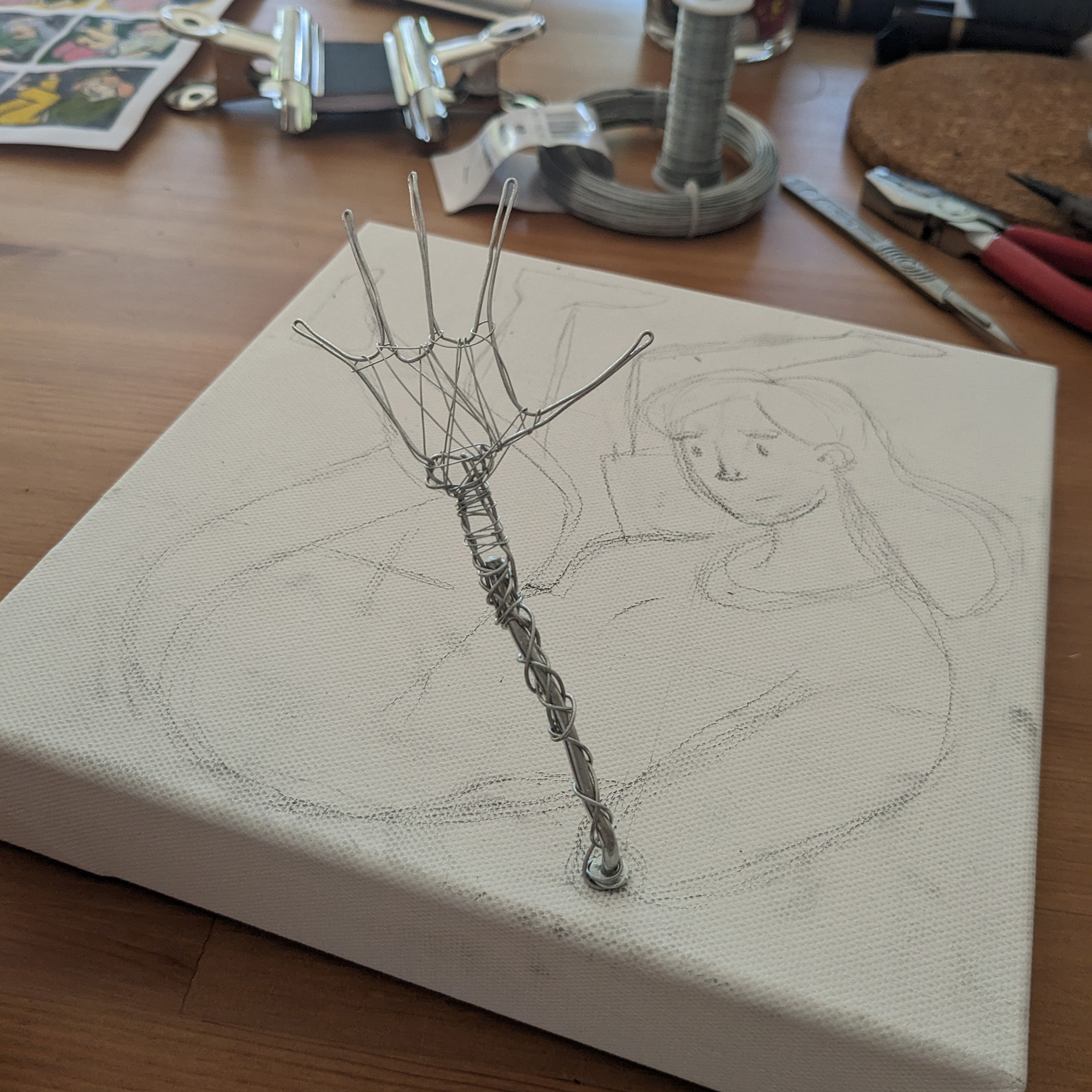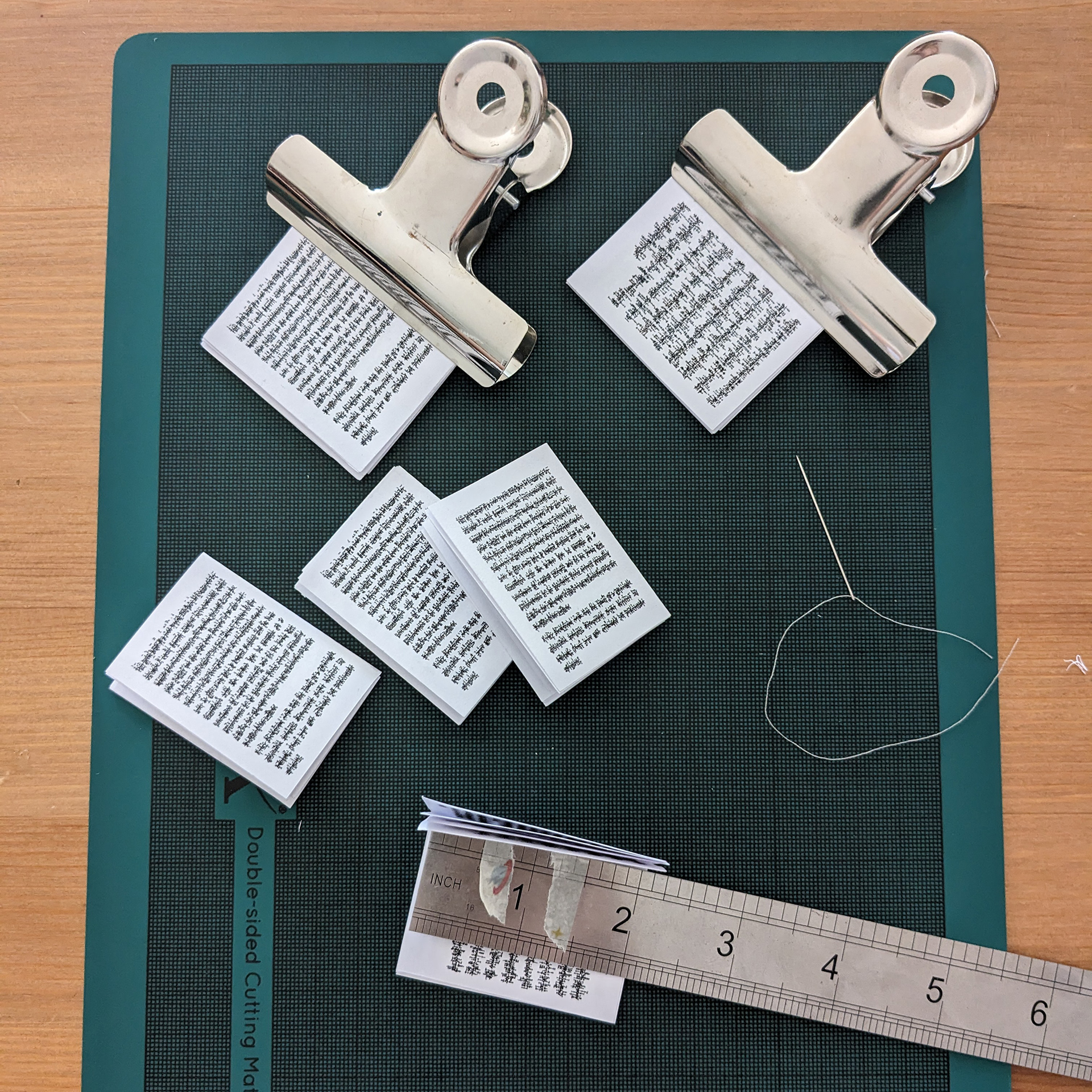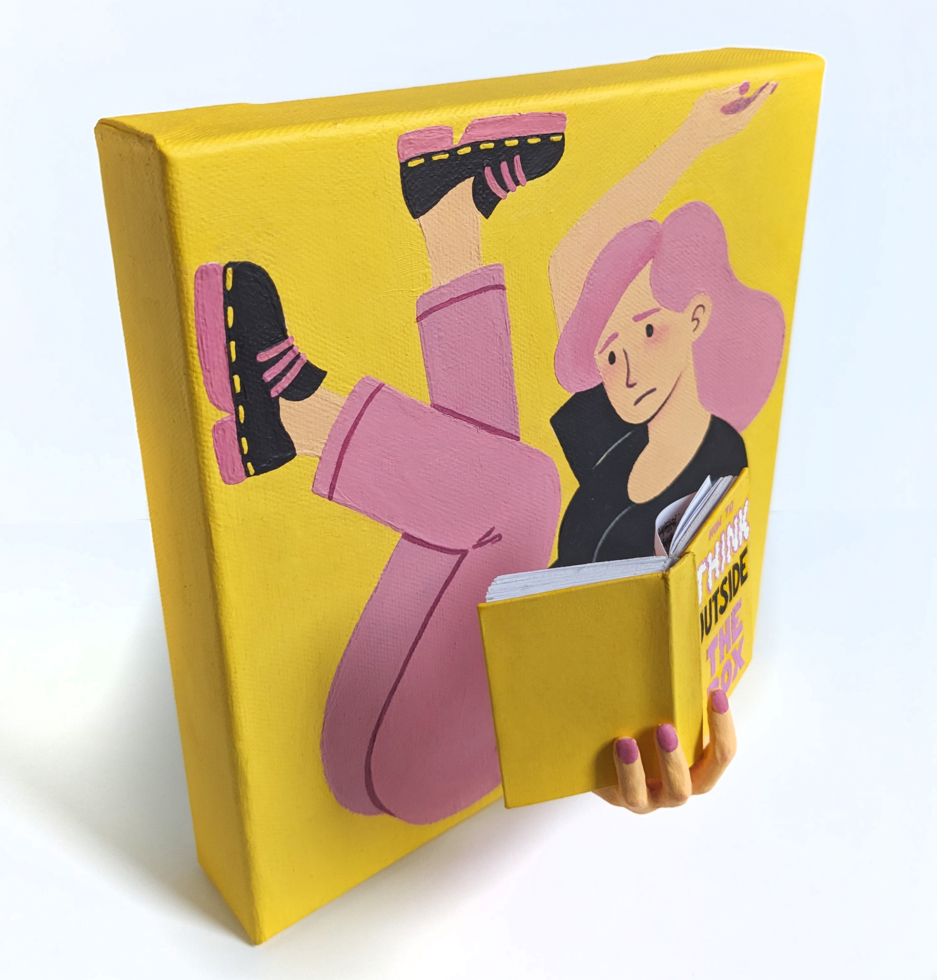 Miniature hand-bound book, armature wire, papier-mâché, and acrylic on canvas.